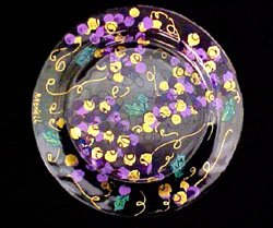 Hand Painted - 10 inch diameter Glass Plate - Our round Plates are very decorative and can be used for display as well as enhancing the food that is served on them. These Plates are exquisitely hand painted on the reverse - not on the cutting surface - with our specially formulated non-toxic paint. Bellissimo!'s many dazzling designs offer a myriad of choices for almost any occasion or decor. - Design chosen for this Plate: GRAPES & VINES - DESIGN DESCRIPTION: Adapted from our wildly popular Wines & Vines Design, the Grapes and Vines Design eliminates the names of wines while featuring a bounty of elaborate clusters of grapes exquisitely hand painted in seven hues of purple with golden accents. Swirling grape vines and leaves complete the design.